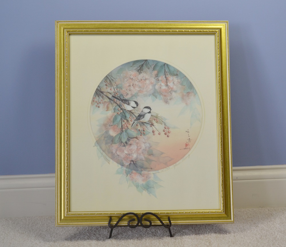 Vtg ltd ed john cheng print finches in blossom tree signed numbered wood frame. Vintage signed john cheng framed print titled the gathering number 197/950, artist signature is in pencil and frame is a gold toned metal excellent condition perfect addition to any room! Cing 4 sau 2 zung 1;